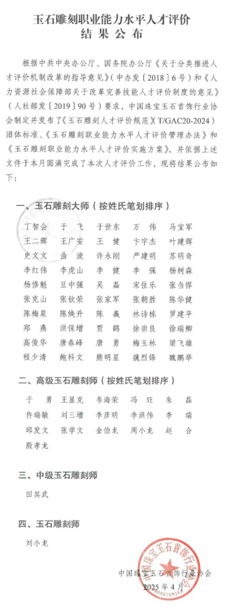 中国宝玉石协会关于玉石雕刻大师和高级玉雕师等考核结果的公布